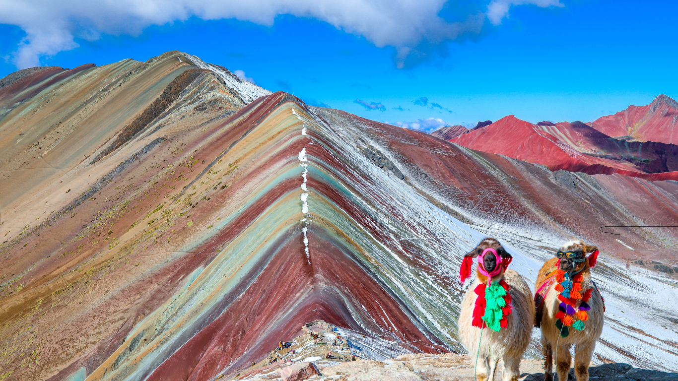 - La caminata tendrá una duración aproximada de 1 hora y 30 minutos hasta alcanzar la altitud de 5,036 metros sobre el nivel del mar, donde se encuentra la Montaña de Colores o Vinicunca. En el transcurso, tendrás la oportunidad de admirar numerosas llamas y alpacas que son atendidas por pastores vestidos con trajes coloridos tradicionales de la región. Pasaremos por hermosas quebradas y estaremos rodeados por las majestuosas montañas Ausangate y Wiñayrity, consideradas tanto en la época incaica como en la actualidad como deidades y seres supremos que nos brindan protección. Casi al llegar a la cima, podrás disfrutar de la impresionante cadena montañosa de Vinicunca.